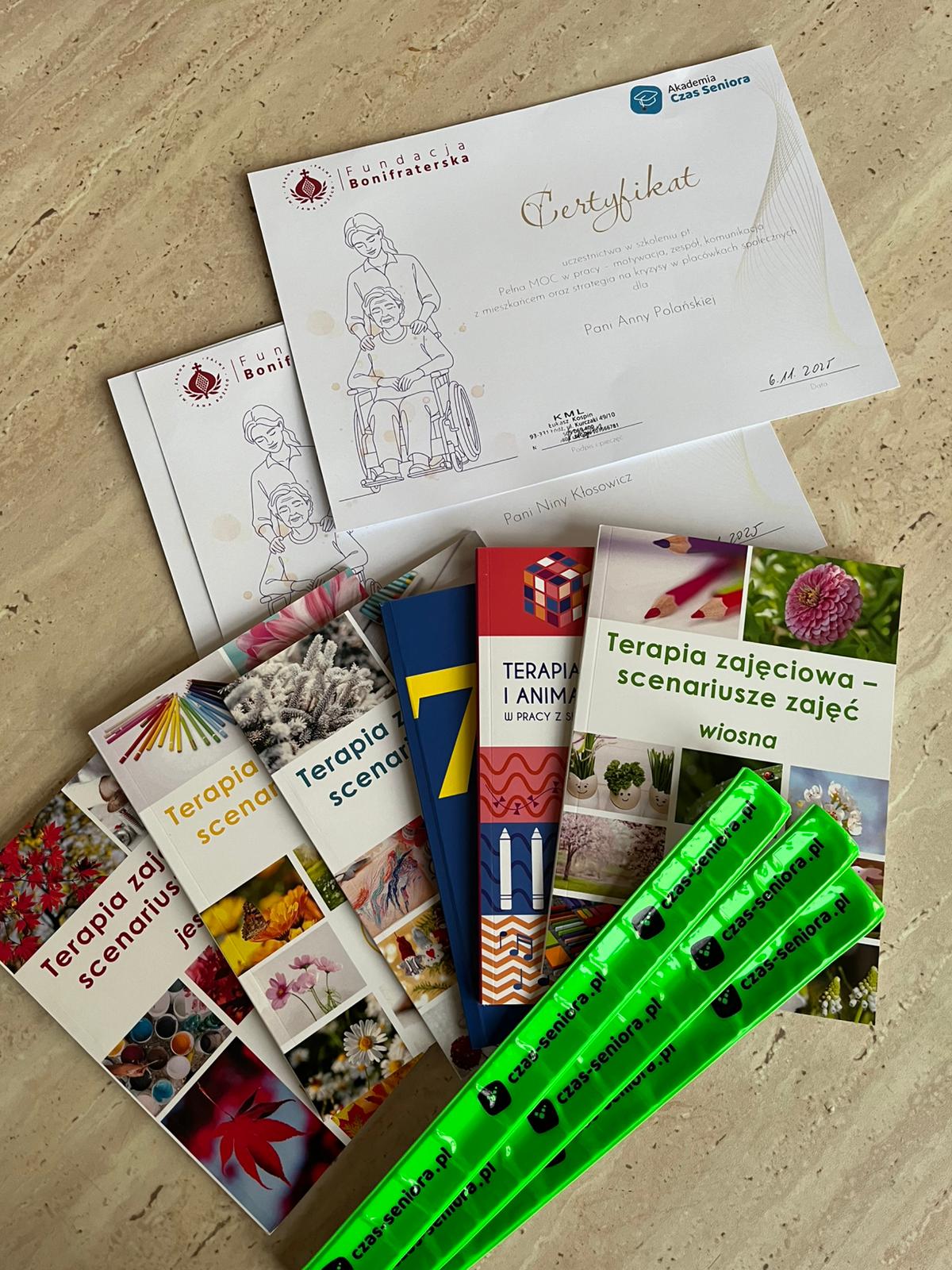 Z radością informujemy, że po odbytym 6 listopada szkoleniu online „Pełna MOC w pracy – motywacja, zespół, komunikacja z mieszkańcem oraz strategia na kryzysy w placówkach społecznych” uczestnicy otrzymali już certyfikaty potwierdzające udział. Do placówek trafiły także specjalne pakiety książek, które zawierają praktyczne scenariusze zajęć oraz materiały dotyczące komunikacji, terapii i animacji – wszystko, co niezbędne do prowadzenia warsztatów i terapii zajęciowej.